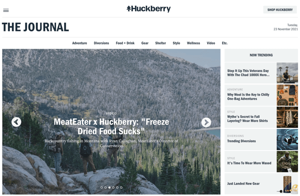 When you enter their main page and click on the category “Journal”, you move from catalog products to inspirational content divided into a few sections like adventure, diversions, style, wellness, etc. This is one of the examples of how Huckberry uses content marketing to get readers to their site. Alongside product descriptions, their digital magazine includes articles about traveling, DIY tips, cocktail recipes, and interviews with influential men.