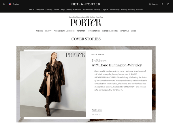 Porter magazine offers more than 300 pages of high-end fashion content, intended to support Net-a-Porter’s shoppable digital magazine.