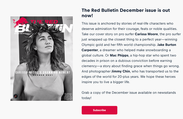 They’ve been publishing an international lifestyle magazine called The Red Bulletin since 2005. It features sports, culture, music, nightlife, entrepreneurship, and lifestyle stories that inspire, entertain, and empower their audience.